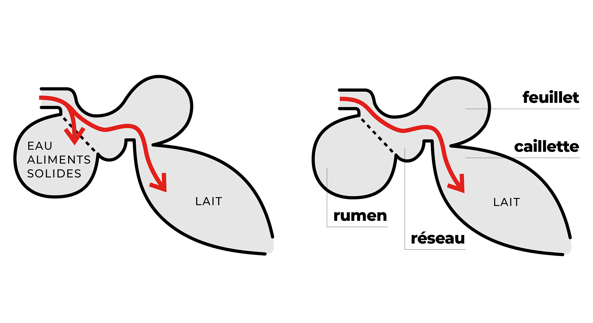 Bei der Geburt funktioniert das Kalb mit einem Mono-Magen: Die Fütterung des Kalbes soll die Veränderungen im Verdauungssystem begleiten. Nach und nach entwickelt sich der Pansen durch Zugabe von festem Futter in die Ration. Darum geht es in der Milchphase. Die Milchaufnahme ist für die Entwicklung des Tieres nicht ausreichend.